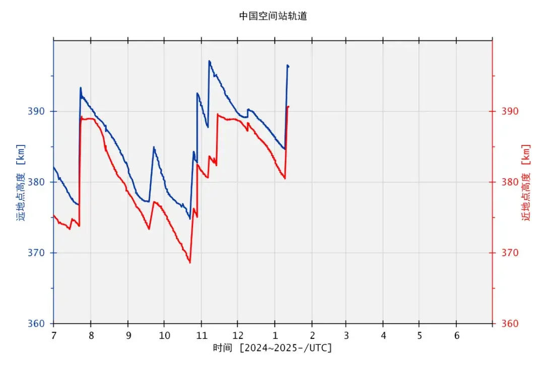 的确,从中国空间站的轨道数据来看,在2025年之中,进行了首次的变轨,并且从380公里的区间,上升到了390公里的区间,并且无论是远地点,还是近地点的高度,都是在390公里以上。